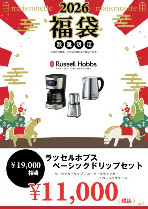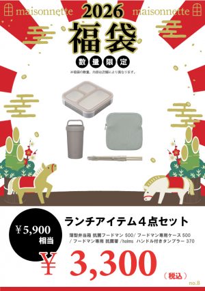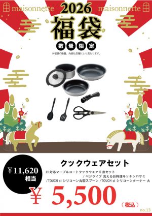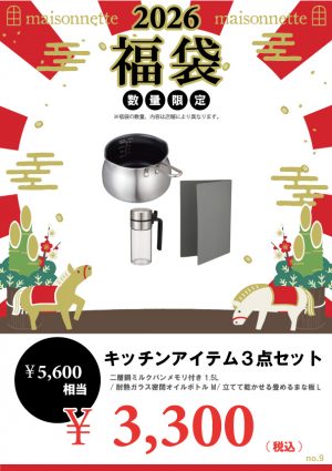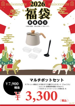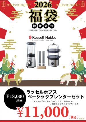 ・事前予約販売は実施しておりません、あらかじめご了承くださいませ。 ・福袋の数量/種類/内容などは店舗により異なります。お近くのメゾネットまでお問い合わせください。 ・写真はイメージです、異なる商品が入る場合がございます。